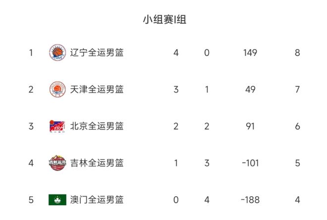 第1名,遼寧隊,成績為4勝0負,積8分;